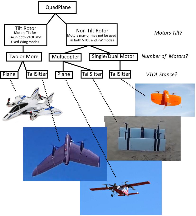 下图展示了各种可能的配置。电机可以受倾斜控制,也可以不受倾斜控制;电机数量可以从 1 个到 8 个或更多不等;QuadPlane 的 VTOL 姿态可以是水平的,就像正常固定翼飞行的飞机,也可以是垂直的(称为尾翼)。
