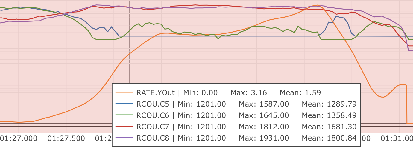 下面的日志显示 RATE.YOut(橙色)在电机 1 (RCOUT.C5) 空转和电机 2 (RCOUT.C6) 几乎不工作时急剧增加,但同时电机 3 (RCOUT.C7) 和电机 4 (RCOUT.C8) 正在运行 > 50% 输出。这就限制了固件在这些电机达到最大值的情况下提高总推力的可能性。