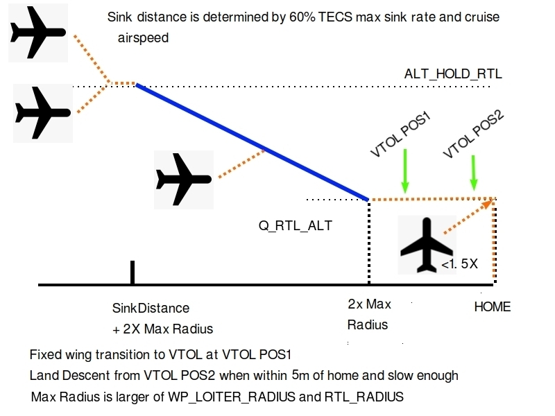 RTL 模式有四种不同的行为选项,但基本上至少在大部分返回过程中使用固定翼飞行。其行为还取决于进入模式时飞行器距离返航点的距离,以及从哪种模式(固定翼或 VTOL/QAssist)进入。RTL 模式的行为由 Q_RTL_MODE 参数,并在下面的章节中进行解释。