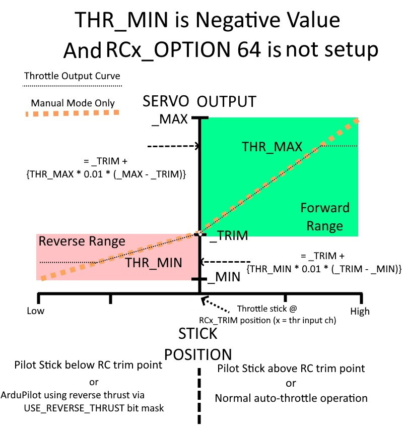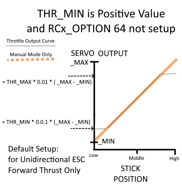 首先,必须了解非反向节流阀的输入到节流阀伺服输出的功能,当 THR_MIN 为零或正值,且未设置反向开关的 RC 选项 (RCx_OPTION = 64)(大多数飞机的通常情况)。