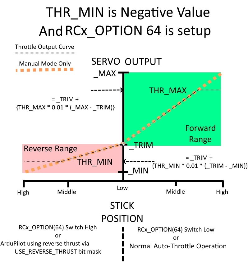 这在使用时可能会有点麻烦,因为将油门杆置于微调死区以停止电机产生推力可能会比较困难。因此,如下图所示,使用遥控开关选项来使用反向推力控制可以使操作更加简单。在这种情况下,遥控通道的 RCxOPTION 已设置为 64。在高位时,这会使油门杆控制反向推力,而不是正向推力。请注意,在这两种情况下,低杆位置(及其上方的死区)产生的推力均为零,而且 RC3_TRIM这也是无关紧要的。