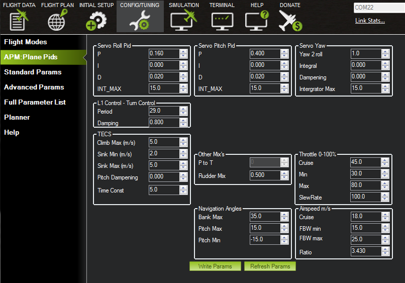 飞机调整的起点是上图所示的飞机 PID 屏幕。在这里您可以调整舵机滚转和舵机俯仰 PID 增益,以便在 FBWA 模式下飞行,还可以调整 L1 控制以获得更精确的水平定位。