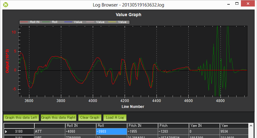 在上面的示例中,载具的实际翻滚("Roll")在日志的前半部分紧跟预期翻滚("DesRoll"),但随后突然偏离。(飞行)控制器希望滚转保持水平("Roll" = 0),但却无法做到,这意味着出现了机械故障。这与软件故障截然不同,软件故障是指(飞行)控制器失控,出于某种奇怪的原因突然希望飞行器上下颠倒,因为在这种情况下,"DesRoll "也会变得疯狂,而实际的 "Roll "也会随之改变。