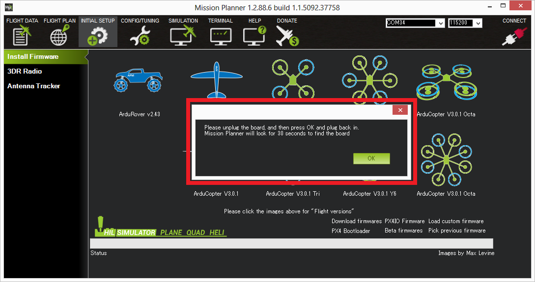 Mission Planner地面站将尝试检测您使用的板。它可能会要求您拔下电路板,按 "确定",然后再插上以检测电路板类型。