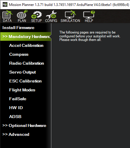 Mission Planner地面站的这一部分由菜单项 设置 在Mission Planner地面站的顶部,有几个子部分。您可以在这些子部分中设置和配置(飞行)控制器,以便为特定飞行器做好准备。通常情况下,这些部分都是首次飞行前必须进行的 "必做 "操作。