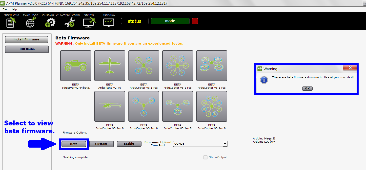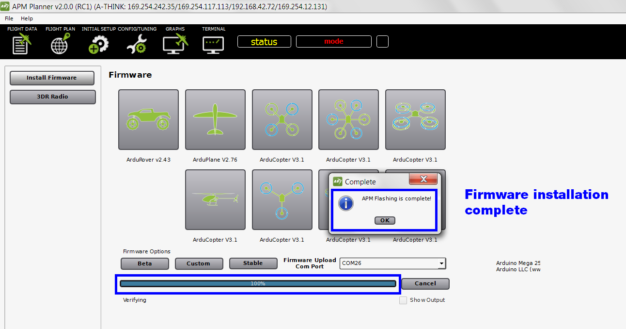 当状态栏达到 100%,固件安装完成时,APM Planner 会通知您。