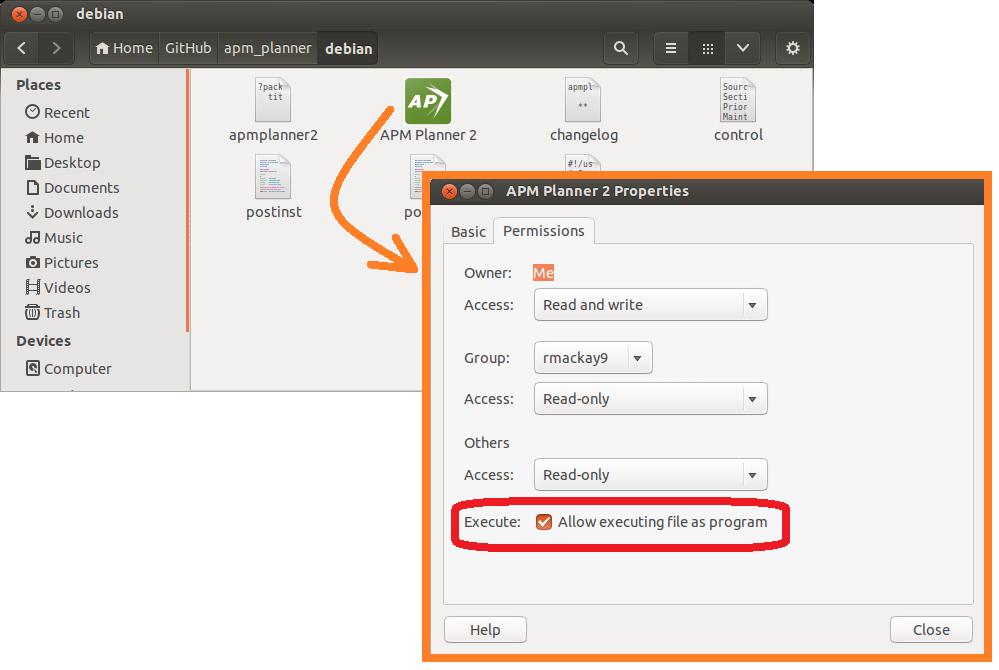 点击 通过此链接下载 apmplanner2.desktop 文件。将文件属性设置为 "允许将文件作为程序执行",然后将文件拖放到开始栏。