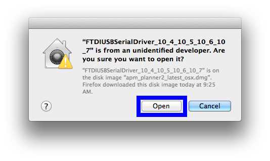 打开 .dmg 文件,可以看到需要安装的一个附加软件包文件:.dmg。 FTDI USB 串行驱动程序.要安装软件包,需要通过按住 Control 键* 打开图标,然后选择 "打开"。完整说明 打开下载的 文件可在苹果网站上找到。