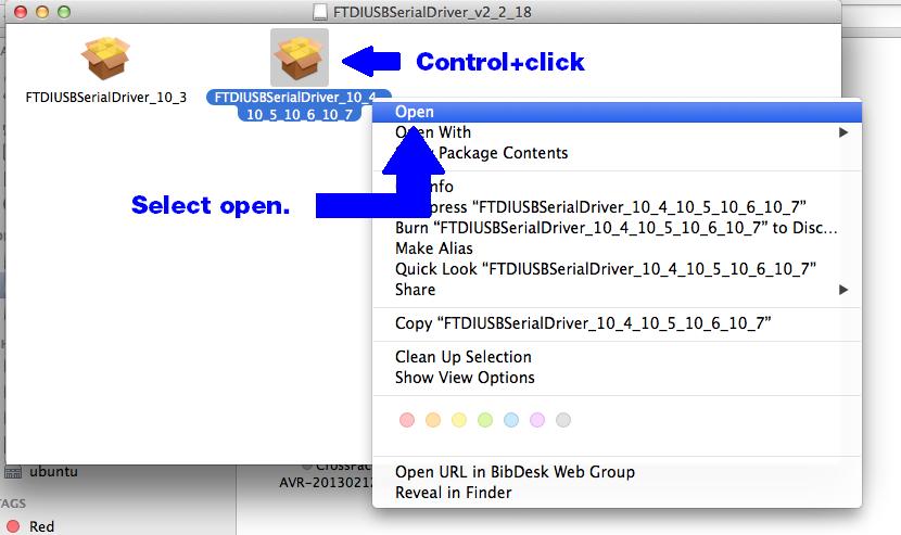 打开 FTDI USB .dmg 文件,查看里面的两个软件包。打开标有"10_4_10_5_10_6_10_7"由 单击点击图标并选择 开放 下拉菜单。这将绕过安全权限,打开软件包。