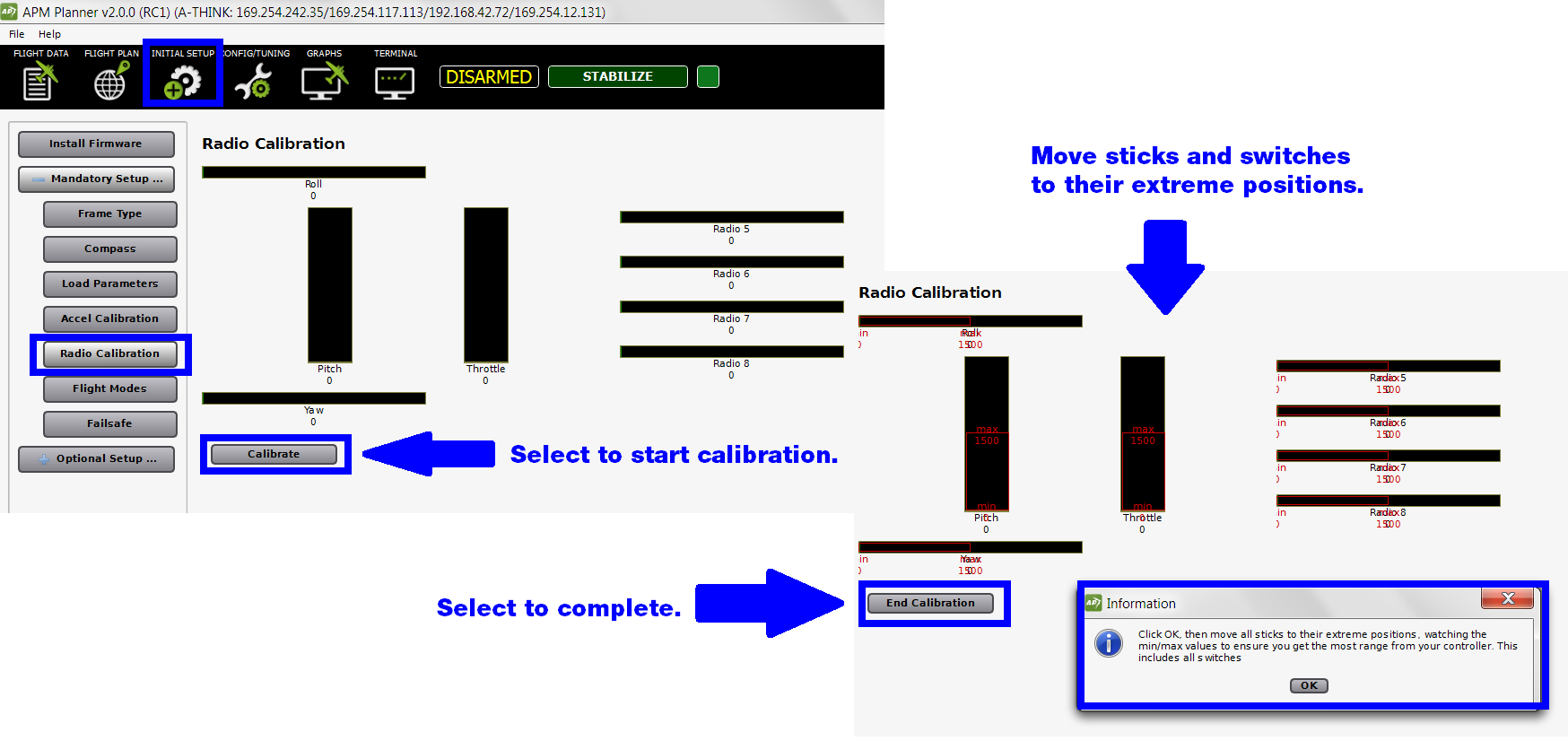 APM Planner2:无线电校准屏幕¶