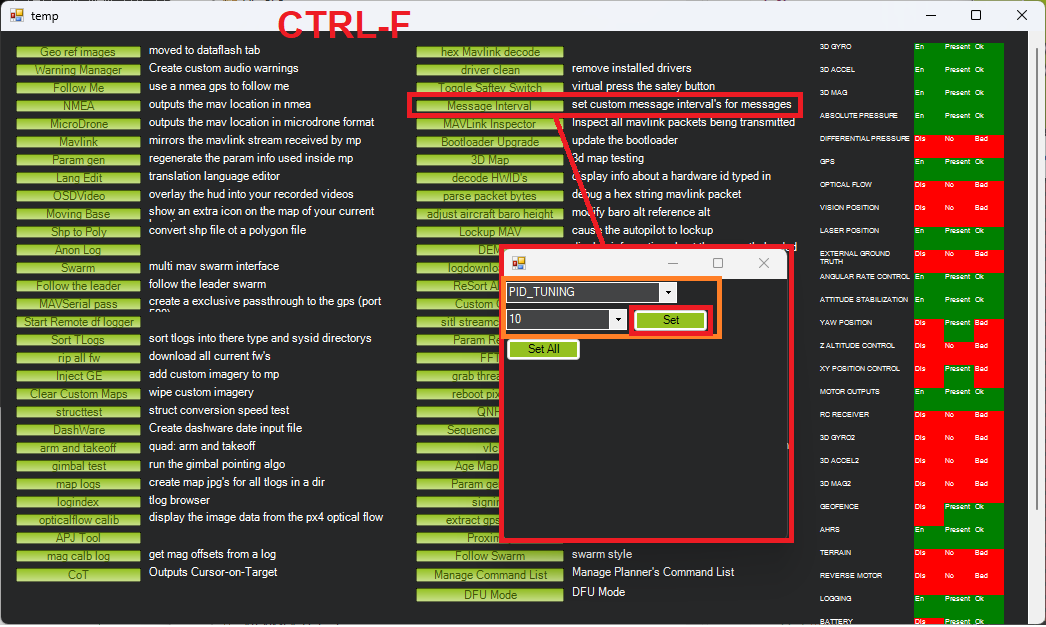 使用Mission Planner地面站的 Ctrl-F 报文间隔功能加快 PID_TUNING 报文的发送速度