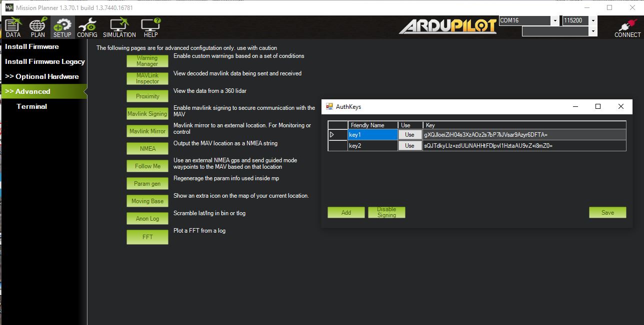 • 在Mission Planner地面站中连接(飞行)控制器,使用设置菜单和高级子菜单,然后按 "Mavlink Signing"(Mavlink 签名)。