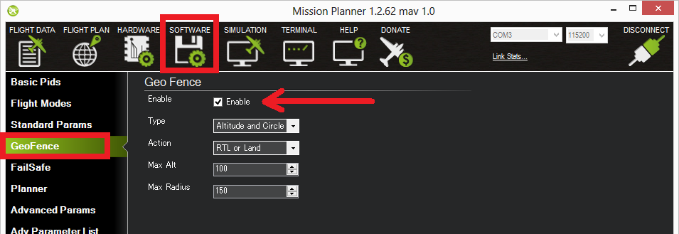 Copter 和 Traditional Heli 与Mission Planner地面站连接后,会出现一个名为 GeoFence 的 CONFIG 选项卡,为这些飞行器提供了访问这些参数的另一种方式。