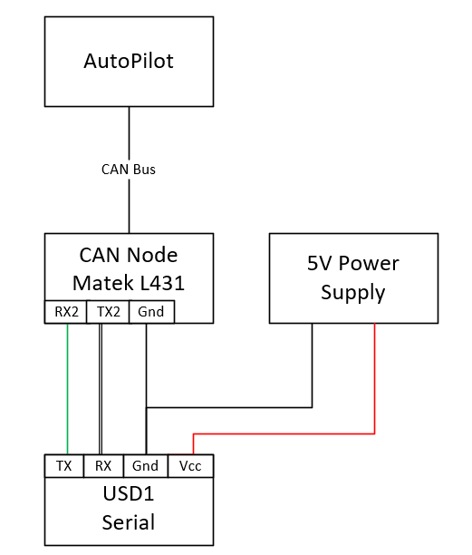 USD1 有 CAN 或串行通信协议两种版本。USD1 CAN 协议与 DroneCAN 不同,因此需要一个运行该协议的专用 CAN 端口。如果(飞行)控制器没有用于连接 USD1 的备用 CAN 端口或备用串行端口,但设置了 DroneCAN 端口,则可以使用连接到 DroneCAN 端口的 AP_Periph CAN 节点在系统中创建另一个串行端口。USD1 必须是串行版本才能正常工作。