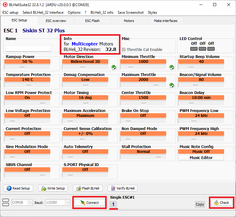 首先确保您的电调安装了适当版本的 BLHeli32 或 BLHeli_S。大多数电调没有预装这些版本。官方 32.7 版本的 BLHeli32 支持双向 DShot。官方版本的 BLHeli_S 不支持双向 DShot,您需要从以下网站购买版本 BLHeli_S JESC 或使用 BLHeli_S BlueJay .如果尝试使用错误的固件版本启用双向 DShot,可能会出现无法预测的电机运行情况。电调转速遥测对于控制谐波带阻滤波噪声滤波器的中心频率特别有用,请参见 基于电调遥测的谐波带阻滤波设置
