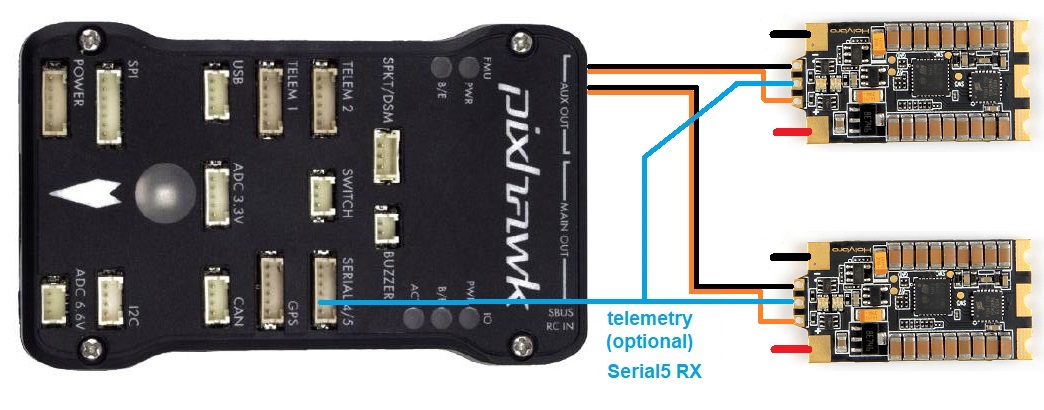 遥测数据可通过与(飞行)控制器 UART RX 引脚的单独导线连接或通过用于传输电机速度信息(双向 DShot)的信号线或基于 CAN 的电调的 CAN 信息传输到(飞行)控制器。对于非 CAN 电子调速器,这种功能主要适用于运行原版或 BlueJay 固件的特定 BLHeli 电子调速器。但是,不执行 BLHeli 固件的电调也有可能提供这种功能。目前,ArduPilot 仅支持与 BLHeli/BlueJay 遥测兼容的电调。