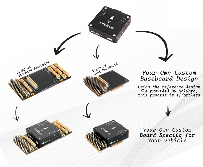 Pix32v6 是 Holybro Pixhawk 6C 的变体。它由独立的飞行控制器和载板组成,通过一个 100 针连接器连接。它专为需要高功率、灵活且可定制的飞行控制系统的飞行员而设计。