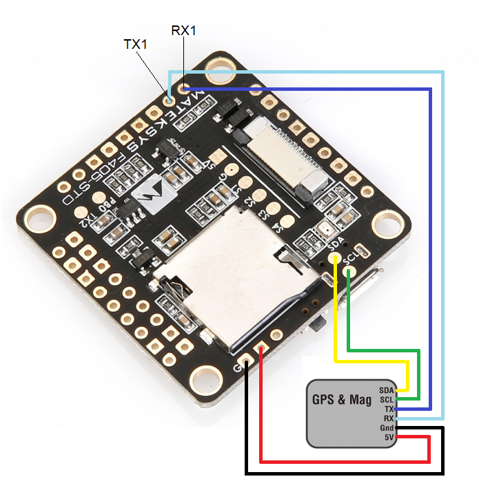 该电路板不包括 GPS 或指南针,因此需要一个 外置 GPS/指南针 应如下图所示连接,以便自主模式发挥作用。