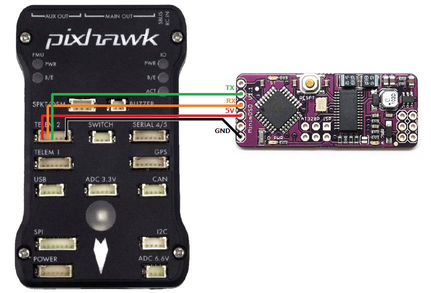 如下图所示,将 MinimOSD 连接到(飞行)控制器的任何一个串行端口。请注意,MinimOSD 只 "监听",因此可以(但不建议)将其与遥测无线电(例如:MinimOSD)并行连接。 SiK 广播电台 或类似)。