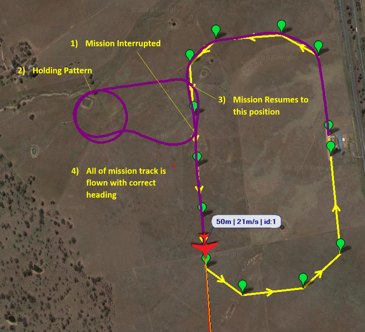 在整个任务过程中,可以设置多个 DO_SET_RESUME_REPEAT_DIST 命令。这使操作员能够在整个任务过程中改变倒带距离或开关该功能,因为在某些任务路段操纵飞行器时需要非常小心和准确。