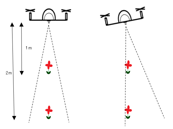 为了将传感器的数值转换为实际移动距离,我们需要考虑高度。这一点很有必要,因为从下面两张图片中可以看出,如果两个四边形移动的距离相同,但一个高度较低,另一个高度较高,那么高度较低的四边形将看到表面特征似乎移动得更远,这将导致更高的光流值