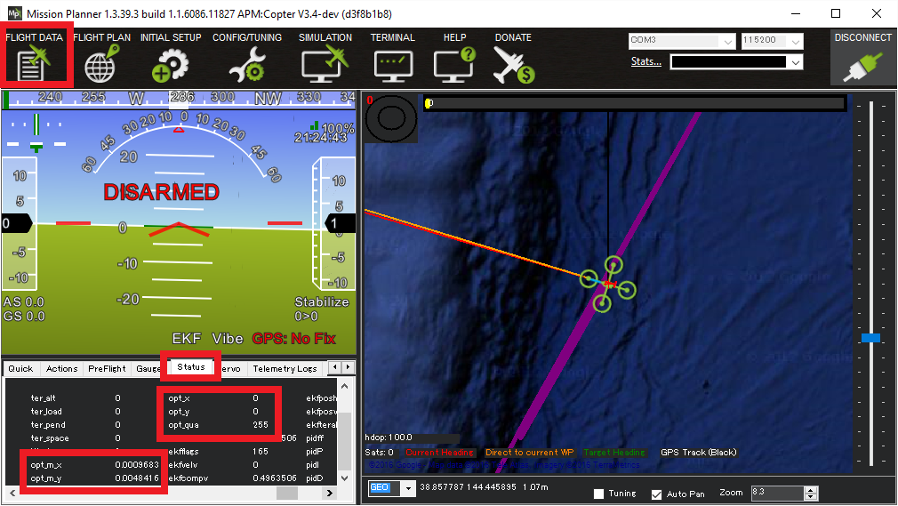 将传感器连接至(飞行)控制器后,使用Mission Planner地面站连接至(飞行)控制器并打开 "飞行数据 "屏幕的 "状态 "选项卡。如果传感器正在运行,您将看到 opt_m_x、opt_m_y 和 opt_qua 值均不为零。