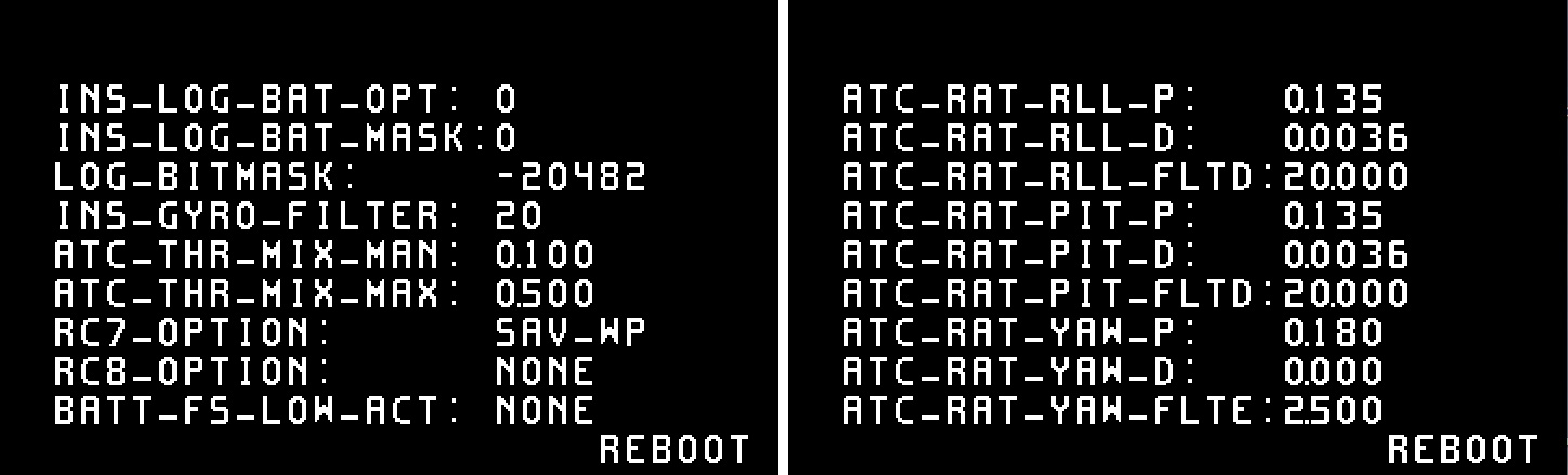 这样就可以使用 ArduPilot 的板载 OSD 和遥控发射机的摇杆输入来设置和调整参数。还有两个额外的 OSD 屏幕(OSD5 和 OSD6)可用,每个屏幕有 9 个 "插槽 "用于保存参数。屏幕显示默认的起始参数集。此外,还可以使用摇杆输入或 MAVProxy 的 osd-module 命令行设置直接(在屏幕上)更改各插槽中使用的参数。