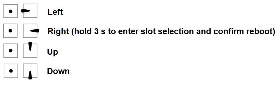 使用遥控发射机的滚动和俯仰输入来浏览参数屏幕。上/下和左/右可以浏览屏幕上的参数槽。所选参数将闪烁。在所选参数上向右移动,使用向上或向下摇杆输入调整参数值。使用左滚动杆输入离开选择。在典型的模式 2 类型发射机上,这将是右万向节摇杆: