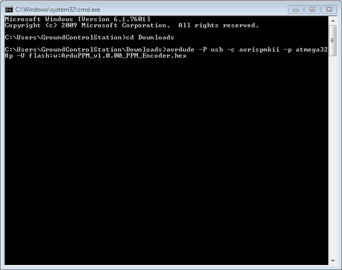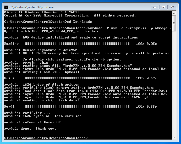然后键入命令:avrdude -P usb -c avrispmkii -p atmega328p -U flash:w:ArduPPM_Vx.x.x_PPM_Encoder.hex(用版本号 x.x.x 代替)。