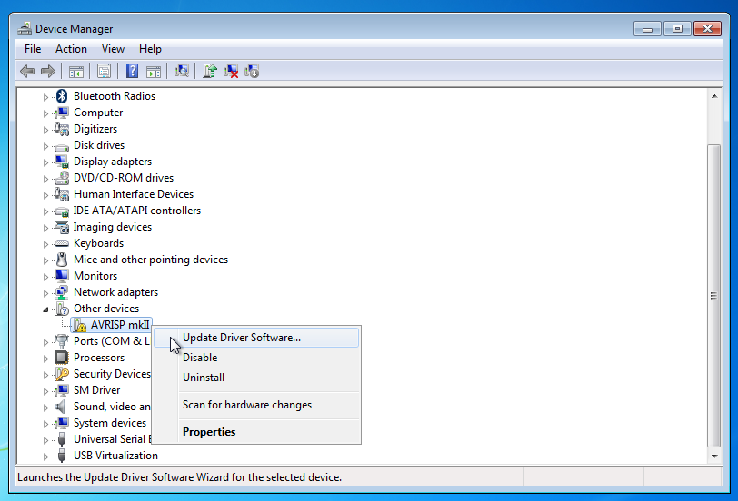 打开设备管理器,选择 AVRISP mkII,选择 "更新驱动程序软件..."