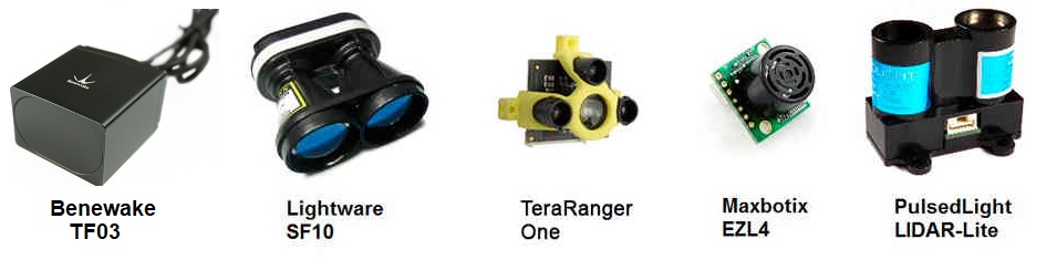 旋翼飞行器/飞机/漫游车支持多种不同的测距仪,包括激光雷达(使用激光或红外线光束测量距离)、360 度激光雷达(可探测多个方向的障碍物)和声纳(使用超声波)。这类设备还包括 Maxbotix 声纳和脉冲光 LED 测距仪。这些设备可用于测量近地距离,以实现精确着陆和高度控制,也可用于测量水深,或作为近距离传感器测量物体距离,以实现精确着陆和高度控制。 物体回避.视觉系统(见 英特尔 RealSense 深度摄像头)也可用于物体回避。