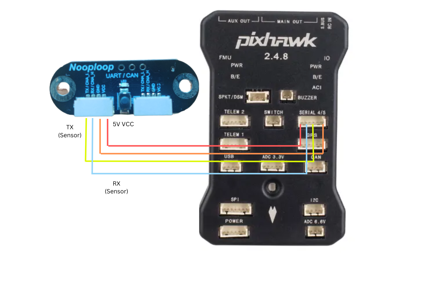 您可以使用任何备用的(飞行)控制器串行/UART 端口。下图显示了如何连接 SERIAL4,示例参数将假定使用该串行端口。