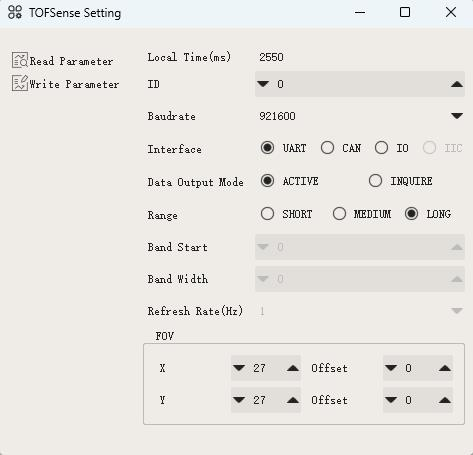 通过制造商提供的 NAssistant 软件设置传感器。更多详情请见 这里.对于 CAN 模式,在设置屏幕中将 "接口 "设为 CAN,模式设为 "活动",比特率设为 "1000000"。如果计划在一条 CAN 总线上使用多个 TOFSenseP,也可以将 "ID "设置为唯一的数字。将 ID 设置为 0 将接受所有 ID。