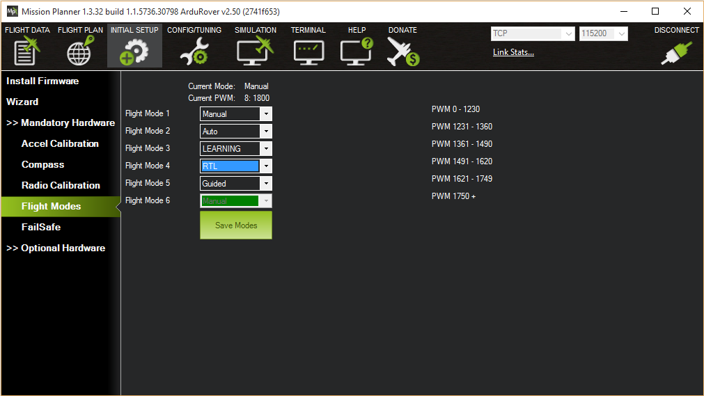可选模式的正确 PWM 范围显示在每个模式选择下拉菜单中。 任务规划飞行模式 屏幕(见 上图截图).