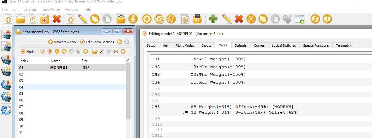 只需选择两个开关(其中一个必须是三个位置),然后将这些混音添加到载具使用的相应飞行模式通道上即可。下面的示例显示了飞机使用通道 8 作为飞行模式(默认),并在 SA 开关向上时使用开关 SB 选择三种飞行模式,而当 SA 不在向上位置时,可通过 SB 选择另外三种飞行模式。