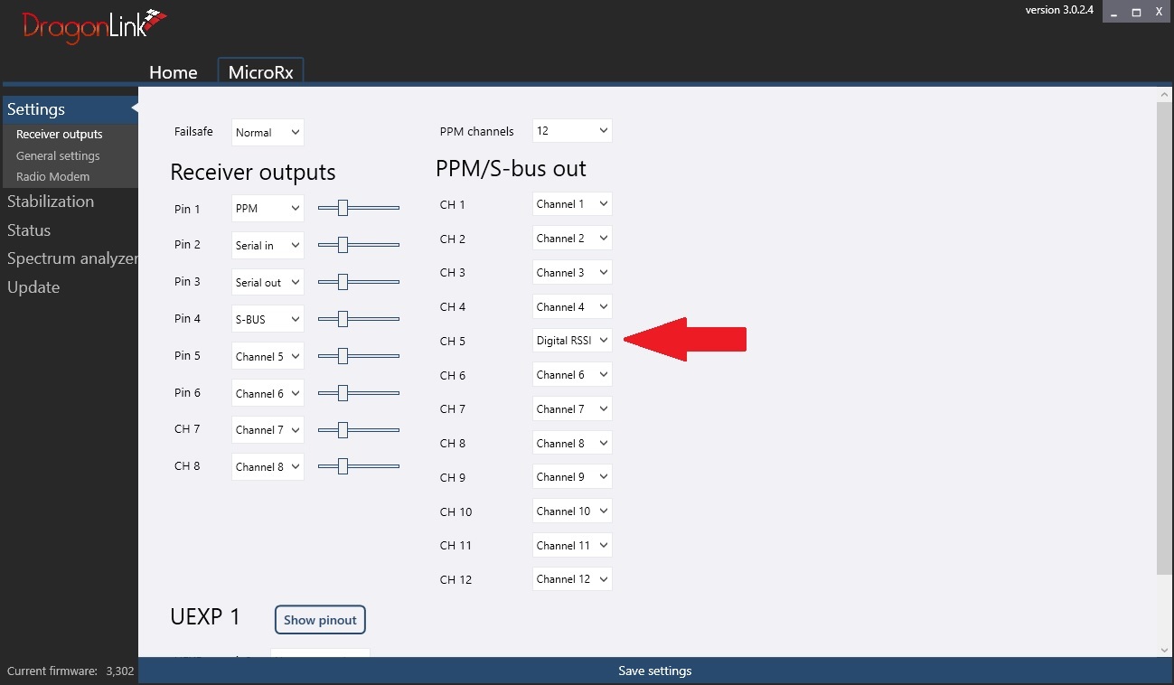 下面的示例显示了如何在 DragonLink RC 接收器上分配通道 5 以嵌入 RSSI: