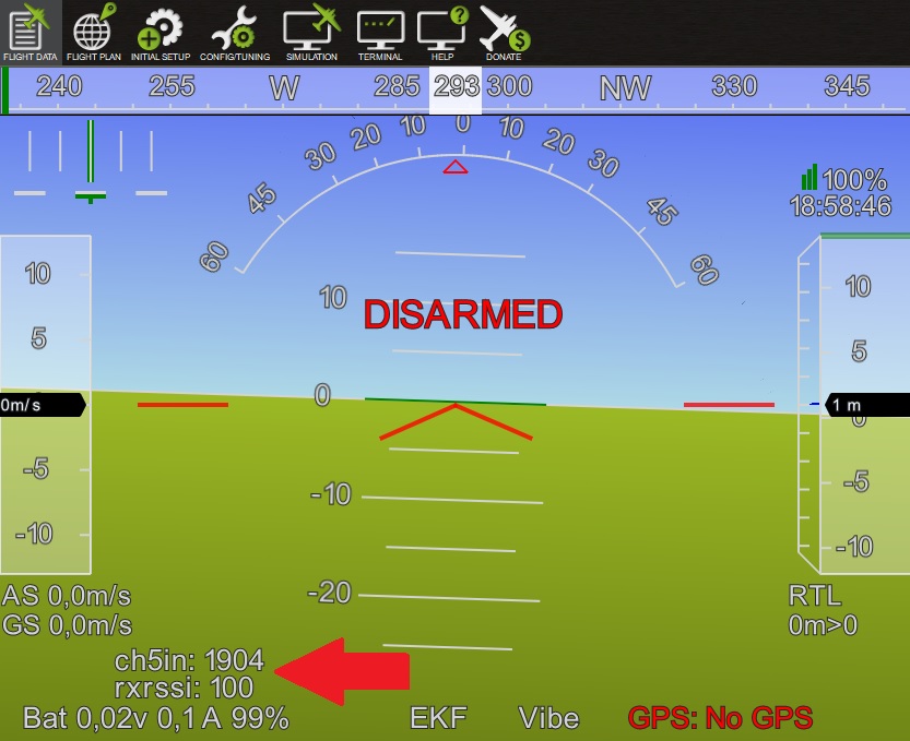在最强接收状态下,Ch5 显示的 PWM 值为 1904 us。关闭发射机后,该值将降至 1093 us。设置 RSSI_CHAN_HIGHRSSI_CHAN_LOW 分别将 PWM 的使用范围缩放至 0 - 100 %,并获得最佳分辨率。