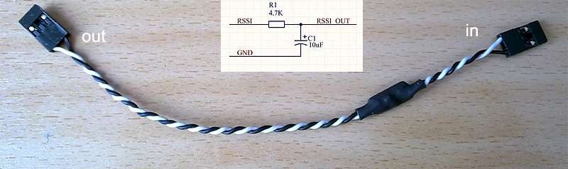 对于非标准 RSSI 类型(如某些 FrSky 接收机的高频 PWM RSSI),可使用 RC 滤波器对信号进行电平处理,使其可用于(飞行)控制器的模拟 RSSI 输入引脚: