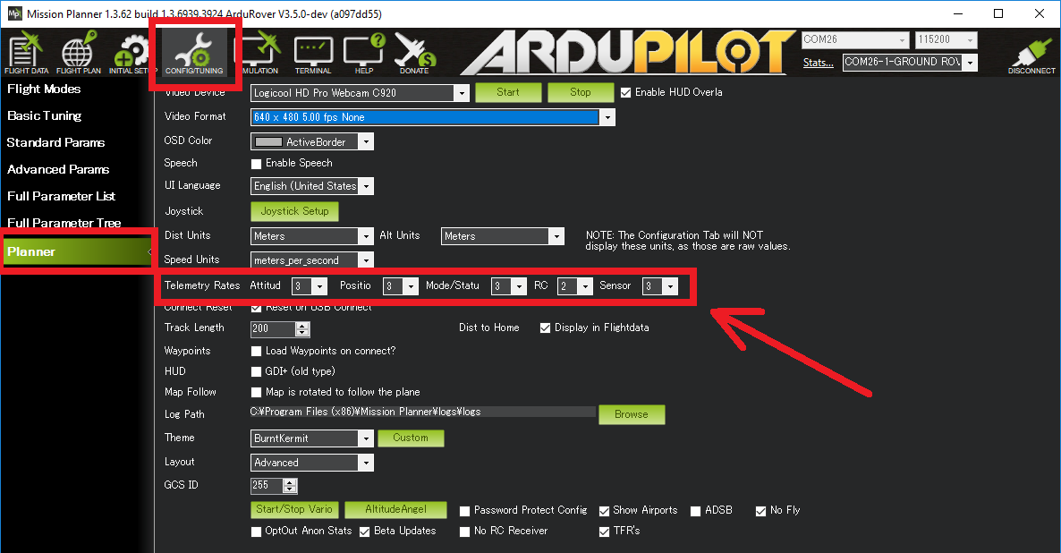 Mission Planner地面站的 配置/飞行稳定调整 |计划器 屏幕的 遥测率 下拉菜单可以方便地设置这些参数。
