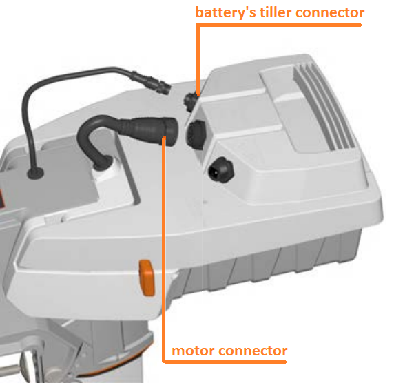 (飞行)控制器可以连接到电池的舵柄连接器或电机连接器上。如果要使用 torqeedo 的内置电池,则应将(飞行)控制器连接到舵柄连接器上。如果使用单独的电池,则应将(飞行)控制器连接到电机连接器上(内置电池可以取下)。