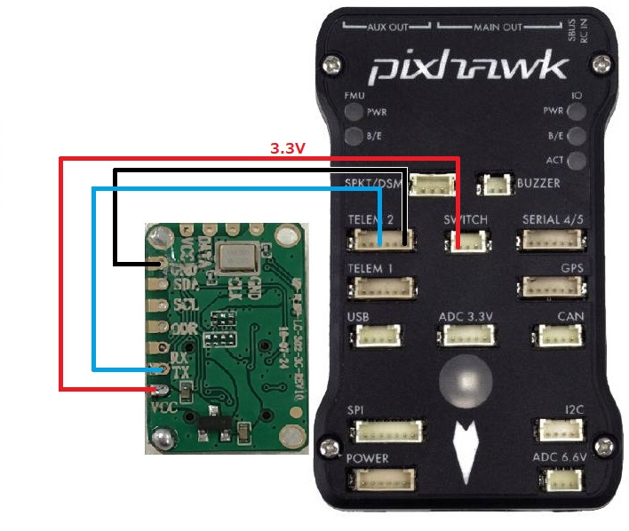 • 将传感器的接地和 TX 引脚连接至(飞行)控制器的一个串行端口。请注意,传感器的 TX 引脚应与(飞行)控制器的 RX 引脚相连。上图中,传感器连接到 Pixhawk 的 Telem2 端口。