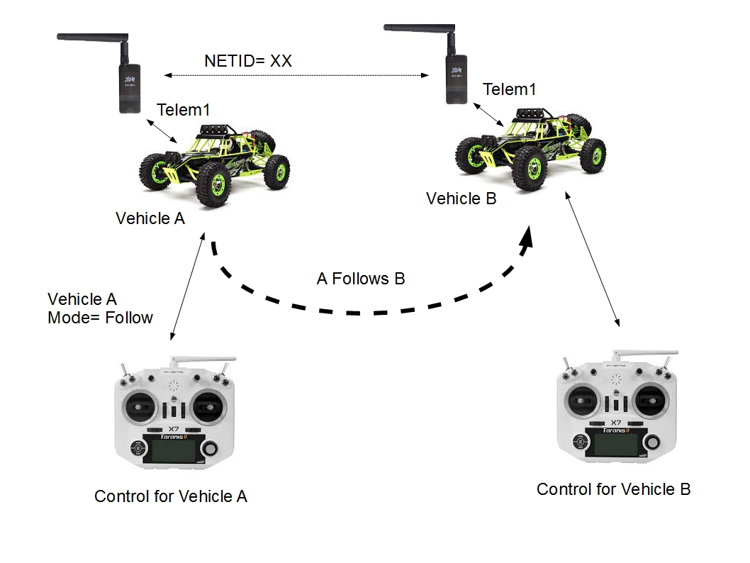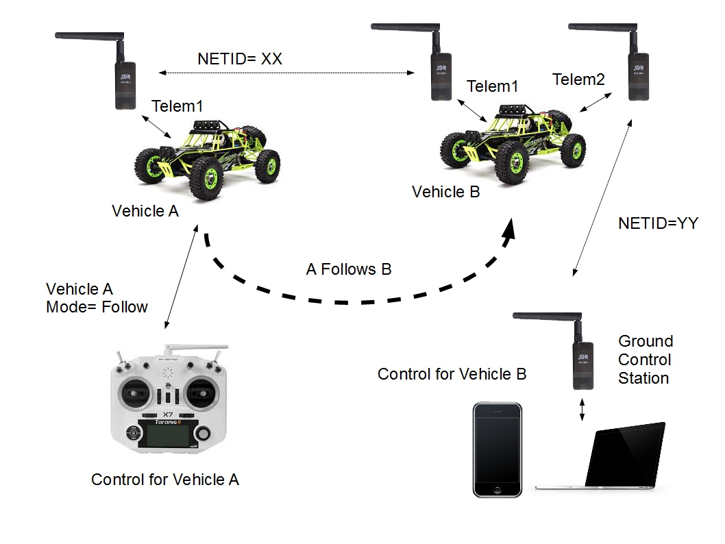 最简单的形式是,每辆车的一个遥测端口上都有一个具有相同 NETID 的遥测无线电。