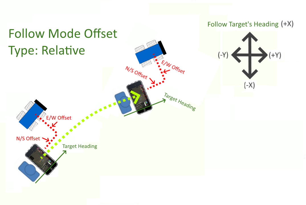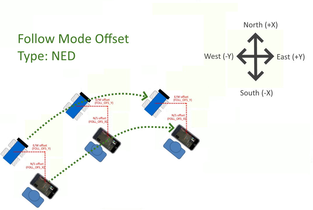 FOLL_OFS_X, FOLL_OFS_Y, FOLL_OFS_Z (不用于漫游车):与前导载具的 3D 偏移量(以米为单位)。如果为零,则每次都使用当前飞行器在进入模式时与跟随目标的偏移量。可以通过 Mavlink 更改这些偏移量,并立即生效。但是,如果这些偏移量原本为零,并且是在 "跟随 "模式下而不是在其他模式下更改的,那么在下一次进入 "跟随 "模式时,这些偏移量将被重置为零,直到重新启动后才会恢复更改后的偏移量。