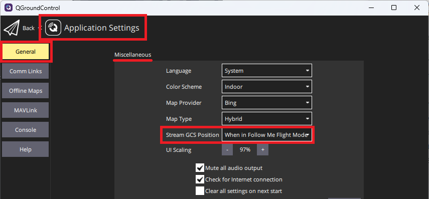 如果使用 QGroundControl,请确保 "常规 "选项卡下的 "应用程序 "设置 流 GCS 职位 设置为 "当处于'跟我飞行'模式时 "或 "始终"。然后连接到载具并切换到 "跟随 "模式,它就会跟随运行 QGC 的电脑/手机。