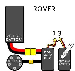 APM、GPS、3DR 无线电和遥控接收器均由 APM 电源模块(随 APM 套件提供)供电。载具的转向伺服器由载具的速度控制器供电。这是标准设置,不需要任何特殊设置或配置,但对于那些想知道功率的人来说,这就是答案。除其他优点外,使用 APM 电源模块意味着 APM 可以进行电压和电流检测,并在运行过程中将电池状态报告给地面站,还可以记录数据,以便运行后进行分析。
