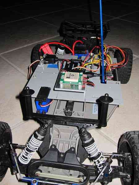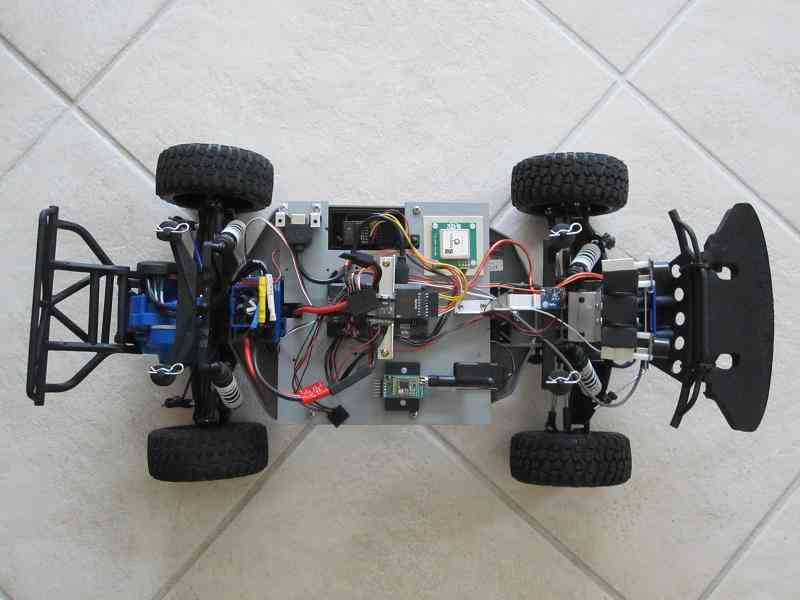 根据您所使用的车架,您可能希望以不同的方式设置您的设备。几乎任何配置都可以使用,但只需记住让 APM 尽可能远离磁干扰源!下图是汤姆-科伊尔(Tom Coyle)的 Slash Rover(2013 年 AVC 自行车组冠军)的俯视图,配有 Spektrum 接收机、GPS 和外部指南针。