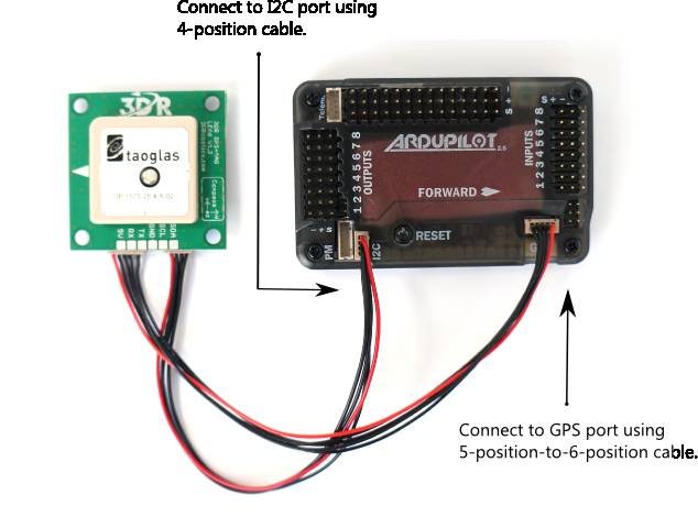 将 GPS 放置在漫游车上的高处,箭头朝前(朝向漫游车的前方)。使用 GPS 随附的两条电缆将 GPS 模块连接到 APM,如下图所示。