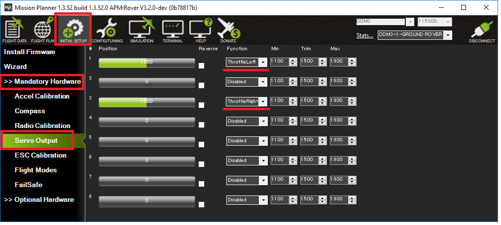 SERVOx_REVERSED值,然后再试一次。如果出现 "命令被拒绝 "信息,或者发动机或转向器对测试没有反应,原因可能写在Mission Planner地面站的 "飞行数据 "选项卡中(见窗口左下方)。常见原因包括未执行无线电校准或