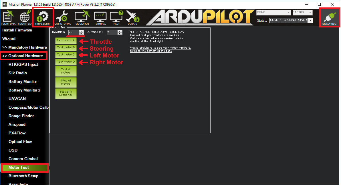 Mission Planner地面站(或许还有其他全球控制系统)可用于测试发动机的方向:
